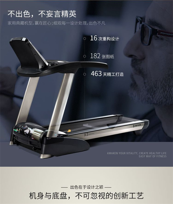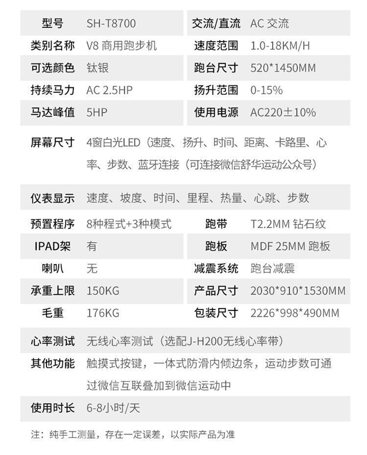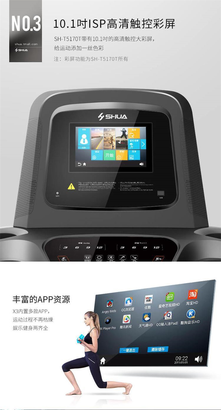 智能商用跑步機SH-T8919T-Y50(V1+)采用T2.2mm黑鉆紋(可選配:T2.4免維護跑帶)的跑帶,選用手握心率測試 自帶心率帶及增加心率控速(HRC)程序模塊測量心跳等數(shù)據(jù),跑步寬度達(dá)580mm,可承受180kg的使用者使用。
