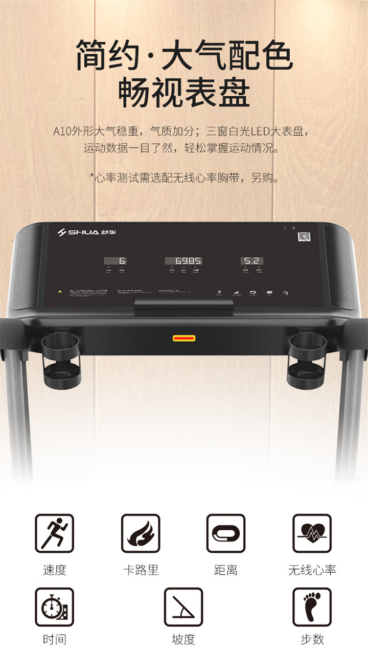 舒華跑步機(jī)SH-T5500采用T18mm的跑板,T1.6 鉆石紋的跑帶,運(yùn)用6位硅膠減震,對(duì)您跑步中的膝蓋進(jìn)行全方位的呵護(hù),選用手握心率測(cè)試,跑步面積達(dá)480×1350mm,可承受126kg的使用者使用。